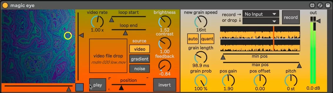 magic eye is a Max for Live audio effect device for video-controlled granular synthesis. The brightness of the selected pixel in the 256×256 viewfinder controls where the next audio grain comes from: darker pixels create grains from earlier in the source audio file, and brighter pixels create grains from later.