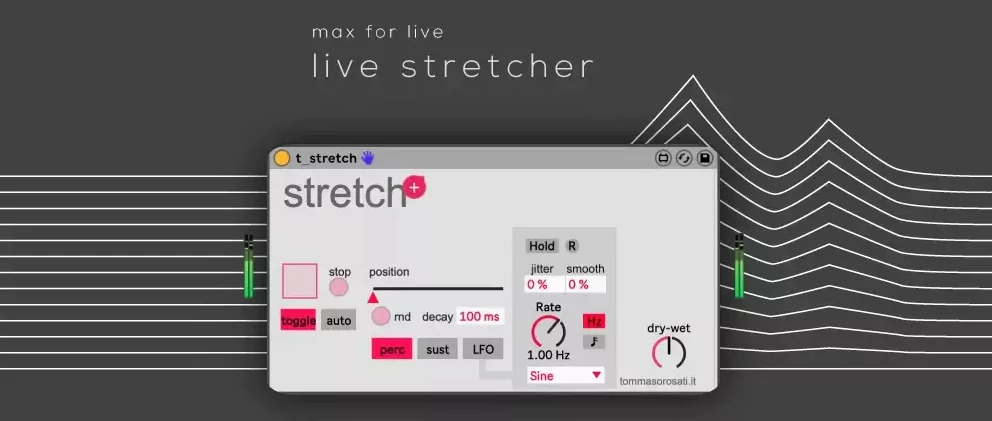 Stretch is a max for live stretch/freeze device. You can manually activate the recording of a portion of sound or automate it with an envelope follower. Once the sample has been recorded you can play it in three modes: percussion (plays a small portion with a selectable decay); sustain (a freeze with a knob to navigate through the sample); LFO (automatically moves through the sample choosing between different waveforms).