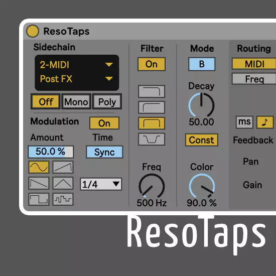 ResoTaps expands on Live’s Resonators concept by incorporating modulation, independent multi-tap delays, and MIDI-side-chaining for real-time resonator tuning.